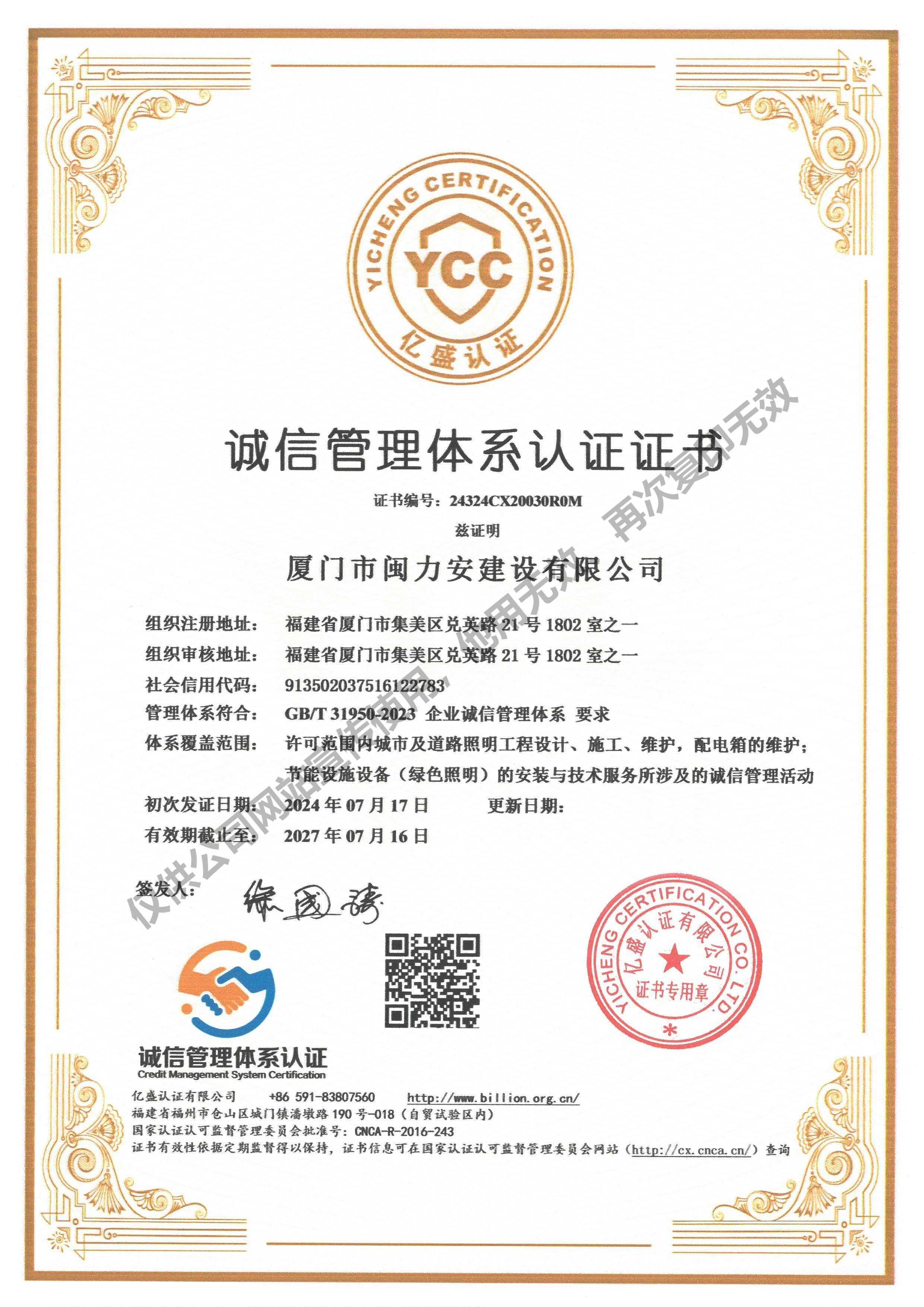 廈門市閩力安建設有限公司成立于2003年,公司取得市政公用工程施工總承包貳級、建筑裝修裝飾工程專業承包壹級、城市及道路照明工程專業承包壹級、電子與智能化工程專業承包貳級、消防設施工程專業承包貳級、電力工程施工總承包叁級、建筑機電安裝工程專業承包叁級、輸變電工程專業承包叁級、環保工程專業承包叁級、照明工程設計專項甲級、建筑裝飾工程設計乙級、施工勞務等資質的綜合型企業,公司于2013年通過了ISO9001質量體系認證,ISO14001環境管理體系認證,OHSAS18001職業健康安全管理體系認證。